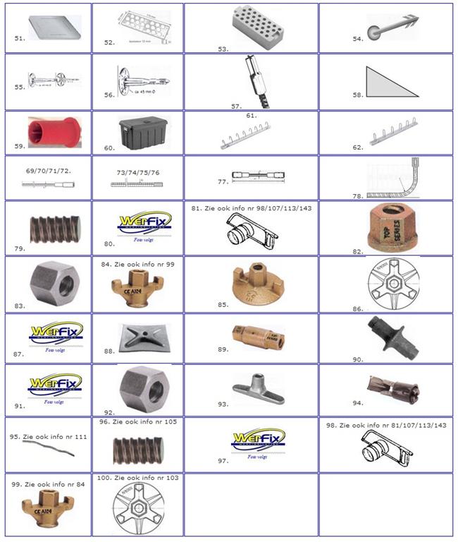 Omwille van het enorm uitgebreide aantal verbruiksgoederen in bekisting en beton, kunnen wij deze slechts stelselmatig invoeren in de catalogus verkoop. Daarom bieden wij u op deze pagina een overzicht van artikel 1 t/m 120. Voor andere artikels kan u kijken bij volgende producten.
