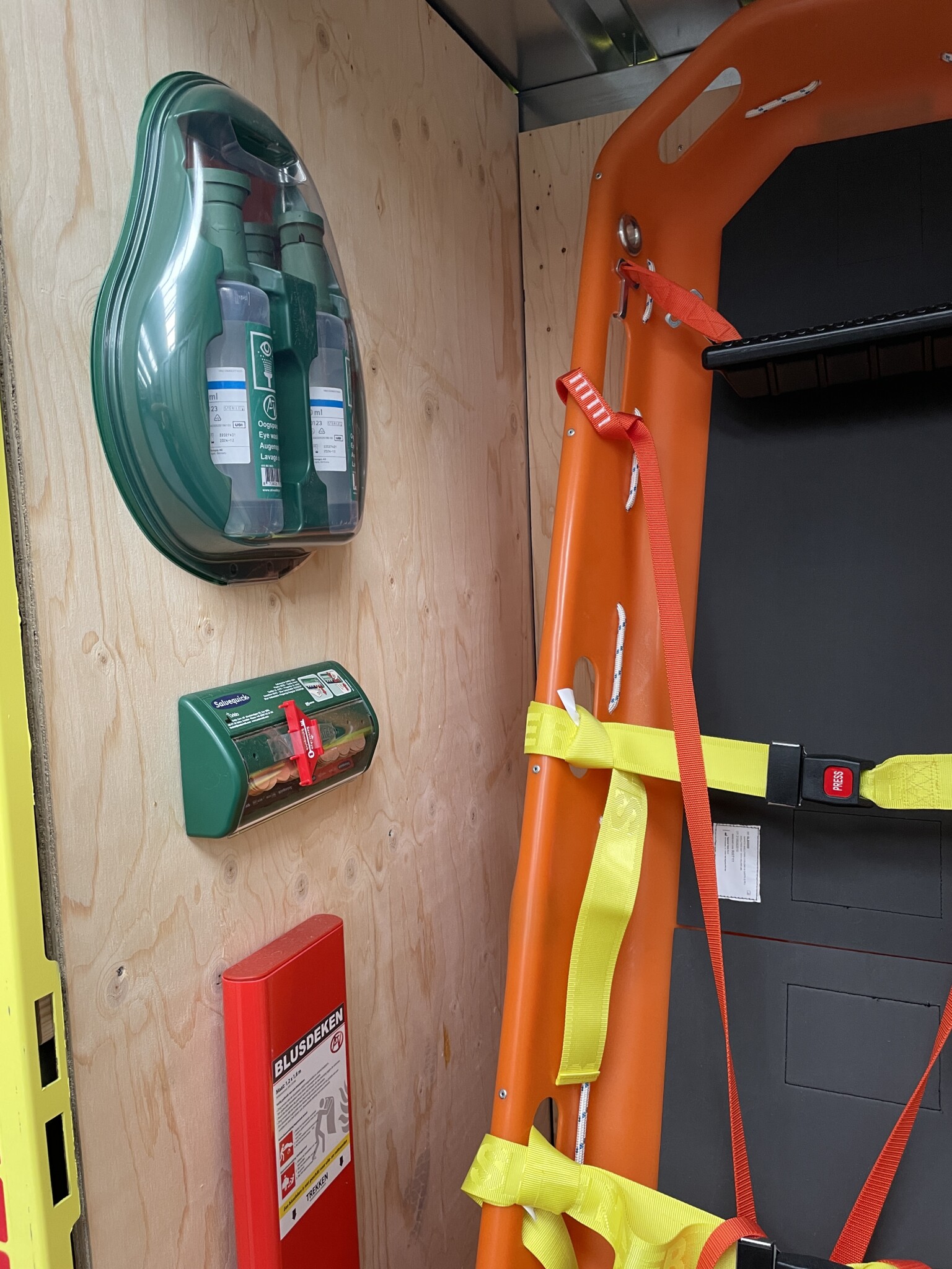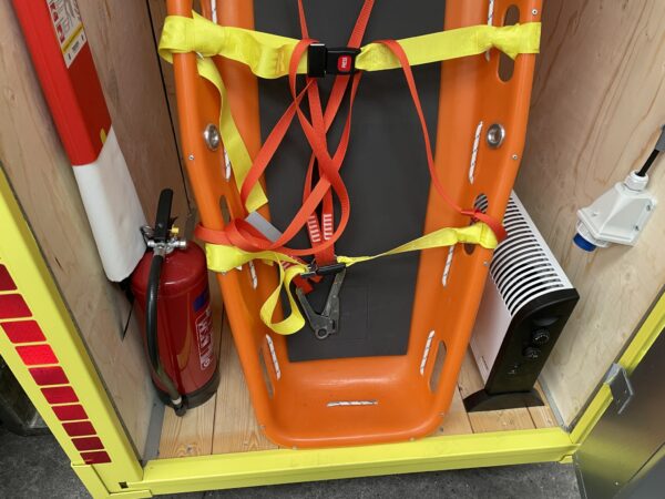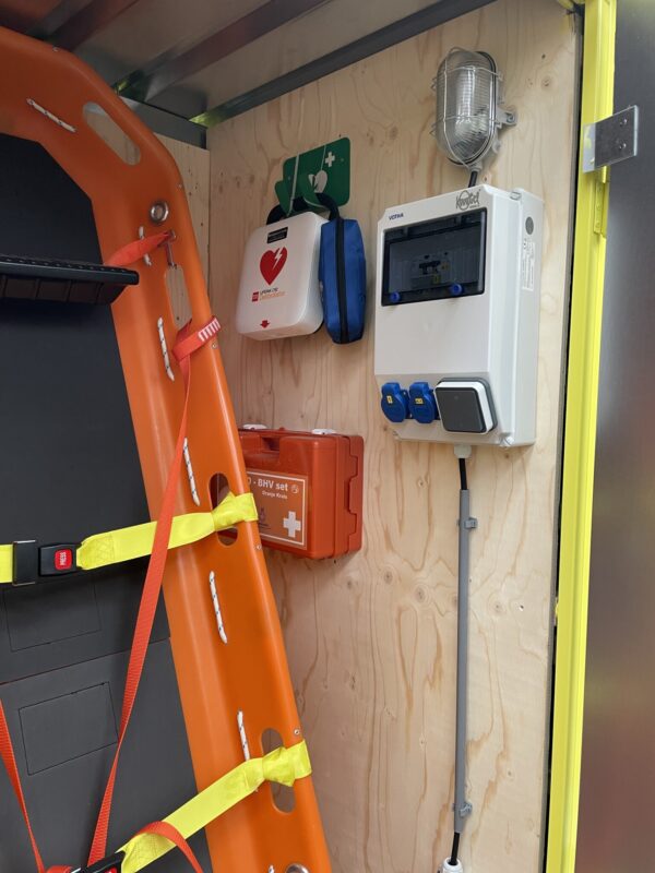 - buitenzijde voorzien van reflectie arcering, AED bord en EHBO bord. De AED is nu een lifepack incl montagebeugel ipv de Philips AED, ivm betere werking in koude en warme omstandigheden.