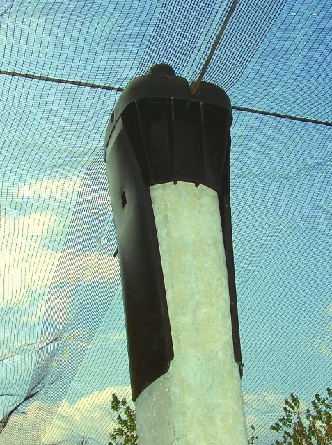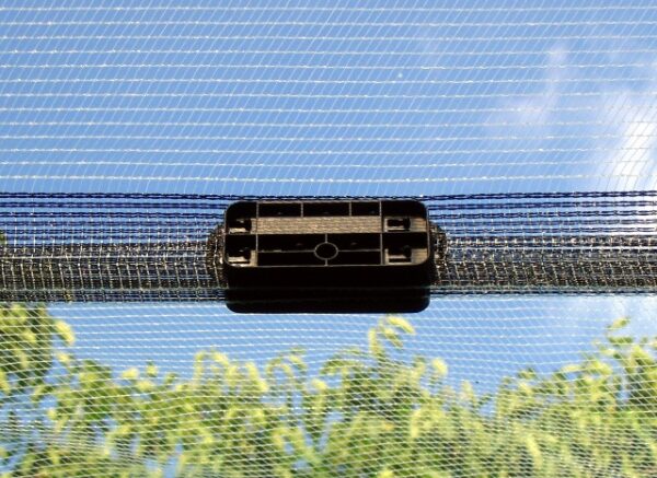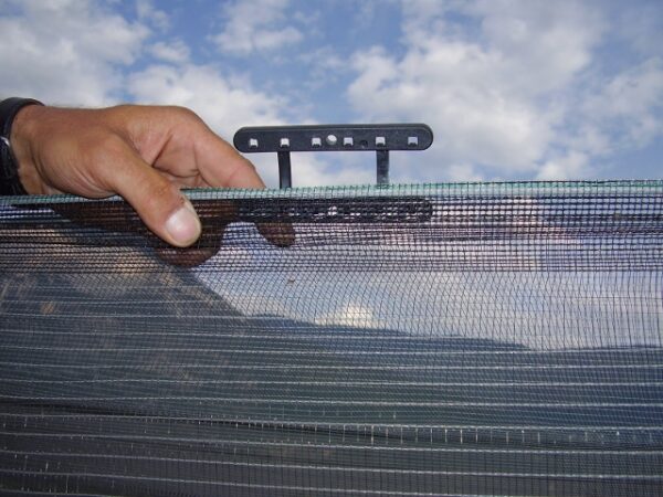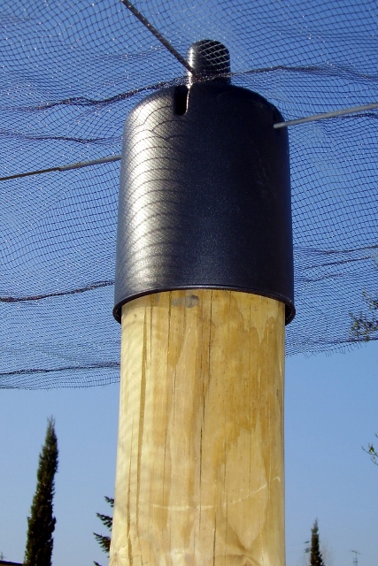 Klemmen en paalkappen voor hagelnetsystemen in kapelvorm met staaldraadconstructies. De klemmen dienen om de 1,00m tot 1,50m te worden aangebracht