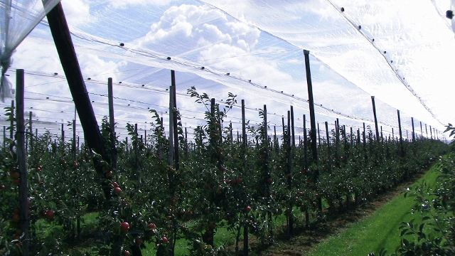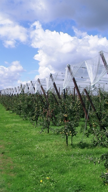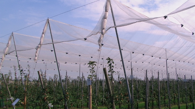 Toepassing hagelnetten : Het efficiënt voorkomen van hagelschade op appelen, peren en kersen. Dankzij een optimale lichtdoorlaat verhogen de netten bovendien de opbrengst en het gemiddeld vruchtgewicht.